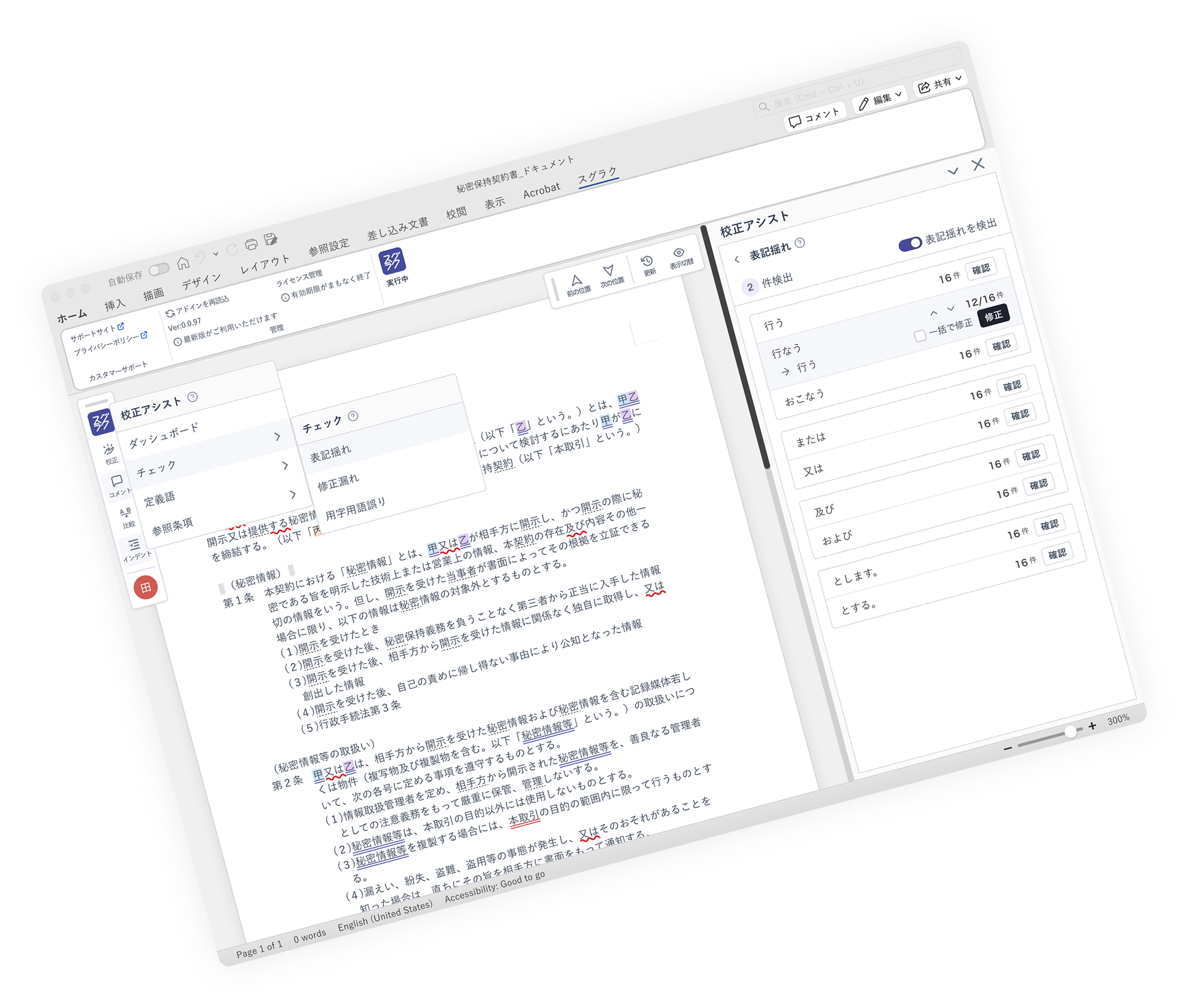 スグラクは、文書のあらゆる作業をサポートするWordアドインです。重要箇所を自動で示すことで文書に向き合う負荷を軽くし、契約書や規程など、様々な文書業務の効率化を支援します。