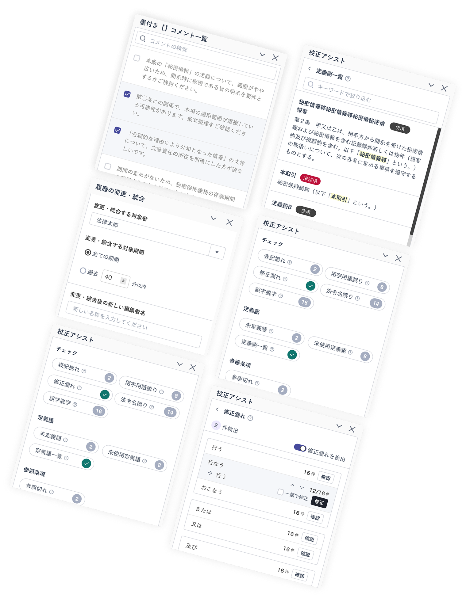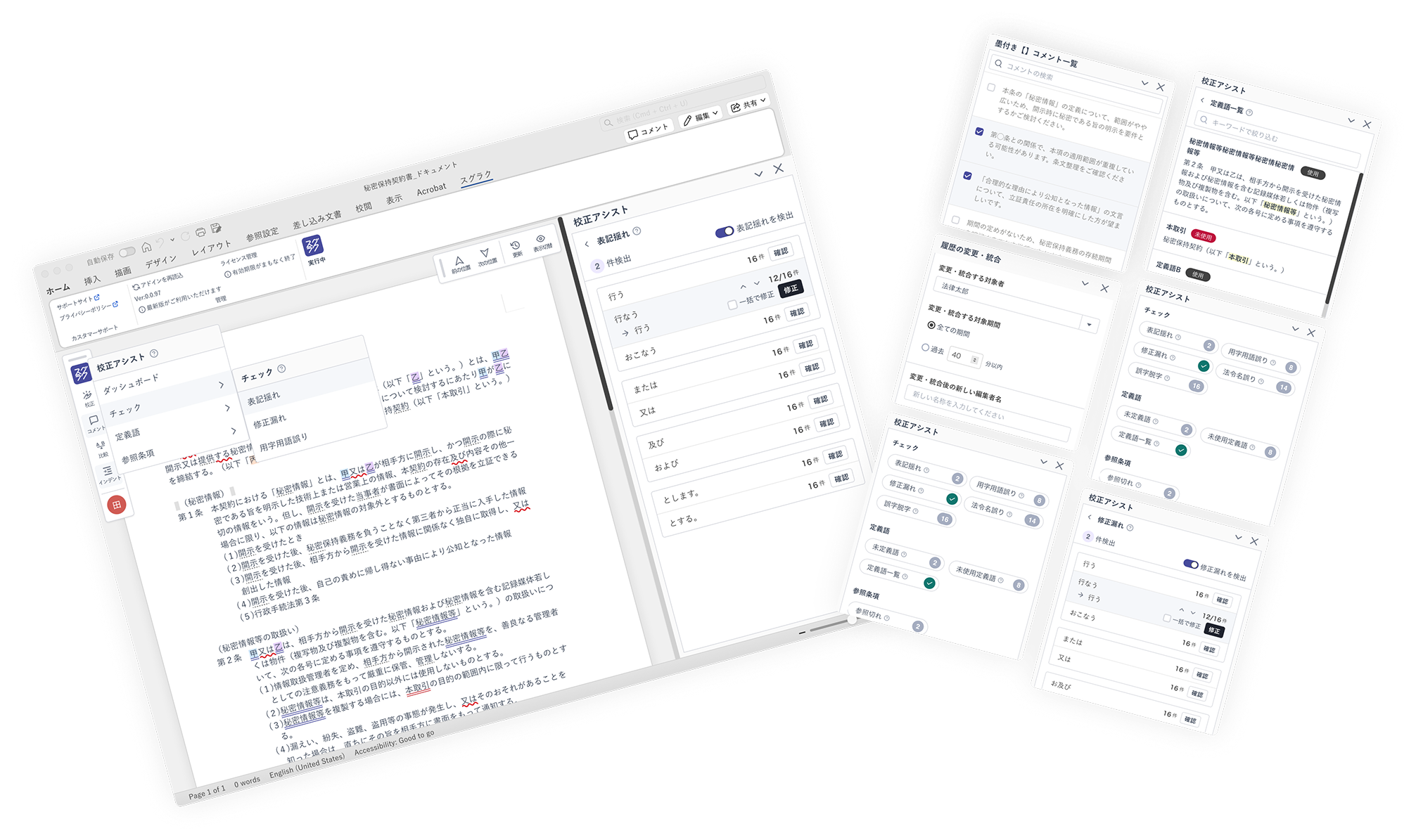 文書のあらゆる作業をサポートするAI搭載のWordアドインです。重要箇所を自動で示し、文書に向き合う負荷を軽くします。